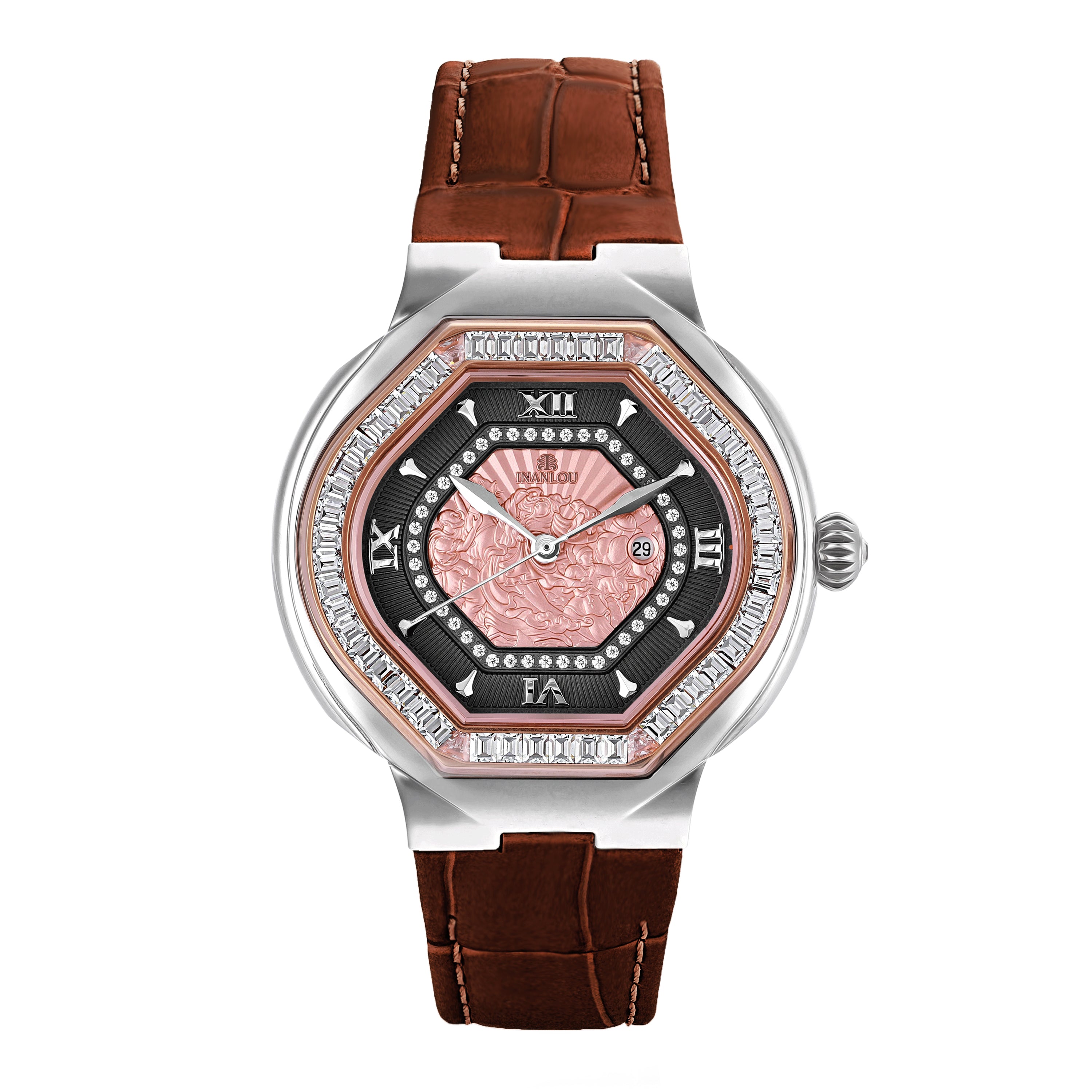 The Silk Road lady watch with its unique body, multi-layered dial, and a delicately carved piece in the center of it, depicts the story of a beautiful, rich woman from the depths of history, whose servants she was attacked by bandits en route to their journey in Silk Road. This beautiful and poetic figure comes from a famous Iranian engraving work. Also on the back door it, beautiful figures have been engraved. This engraving of the rose gold color is in harmony with the rose gold bezel cover and also creates a nice harmony with the gray color on the rim of the dial, with a border of brilliant Swarovski stones. The numbers and markers as well as the hands and the crown are perfectly designed in harmony with the overall design of the watch. The date index has been placed at three points. The crown is decorated with a Swarovski stone.