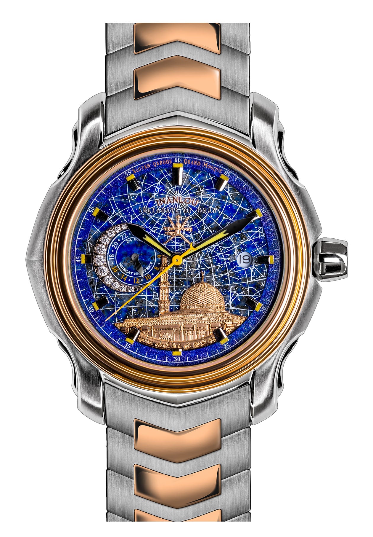 The multi-layered and fine dial of the Oman watch, which is its lower layer made of lapis lazuli stone in a beautiful blue color, is a metaphor for the night sky. The outline of the stars of Muscat sky on it with a beautiful moon covered with Sovarowski stones narrates the calm and relaxing sky of Muscat Nights. The Lapis lazuli stone is a symbol of power and wisdom that balances the soul and the mind.