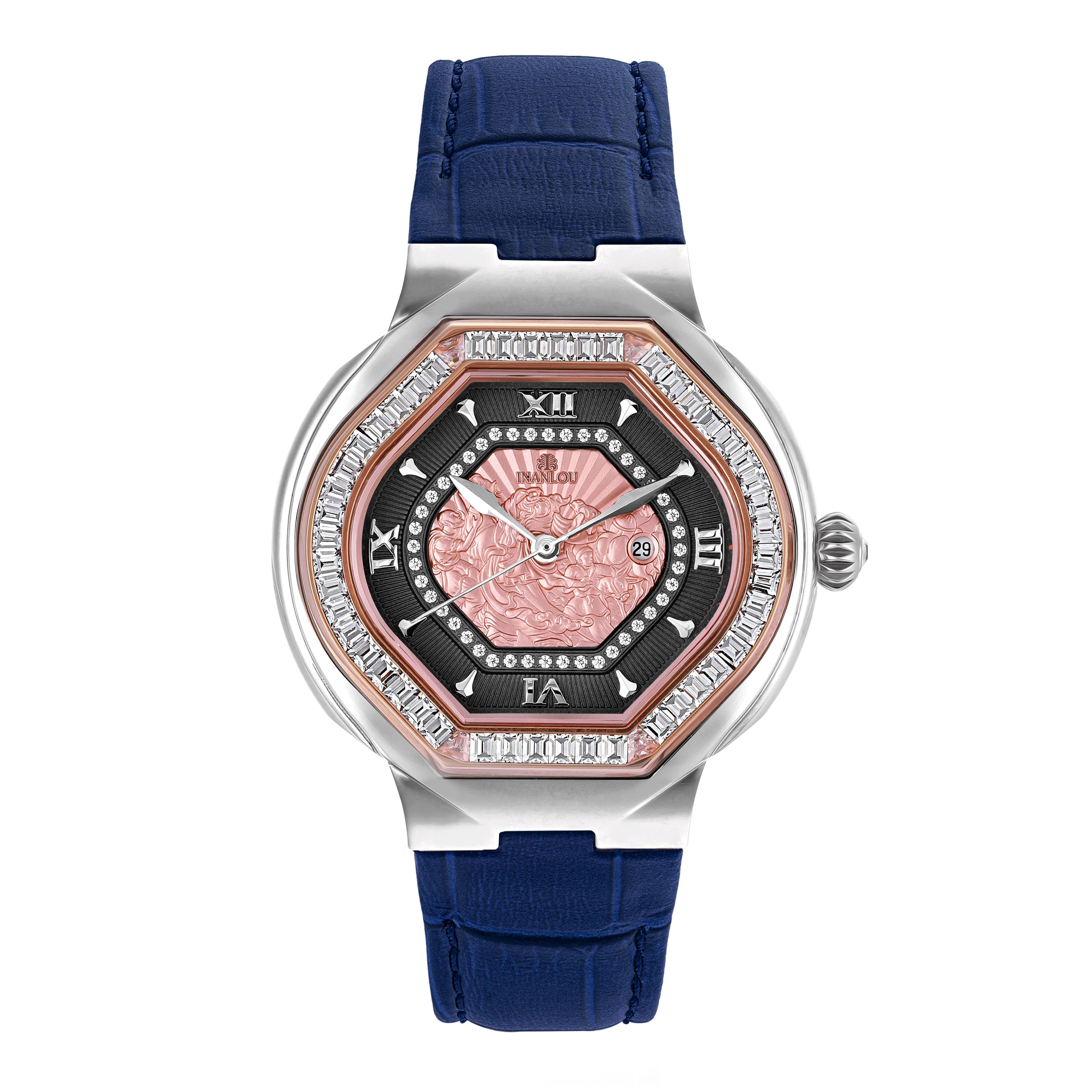 The Silk Road lady watch with its unique body, multi-layered dial, and a delicately carved piece in the center of it, depicts the story of a beautiful, rich woman from the depths of history, whose servants she was attacked by bandits en route to their journey in Silk Road. This beautiful and poetic figure comes from a famous Iranian engraving work. Also on the back door it, beautiful figures have been engraved. This engraving of the rose gold color is in harmony with the rose gold bezel cover and also creates a nice harmony with the gray color on the rim of the dial, with a border of brilliant Swarovski stones. The numbers and markers as well as the hands and the crown are perfectly designed in harmony with the overall design of the watch. The date index has been placed at three points. The crown is decorated with a Swarovski stone.