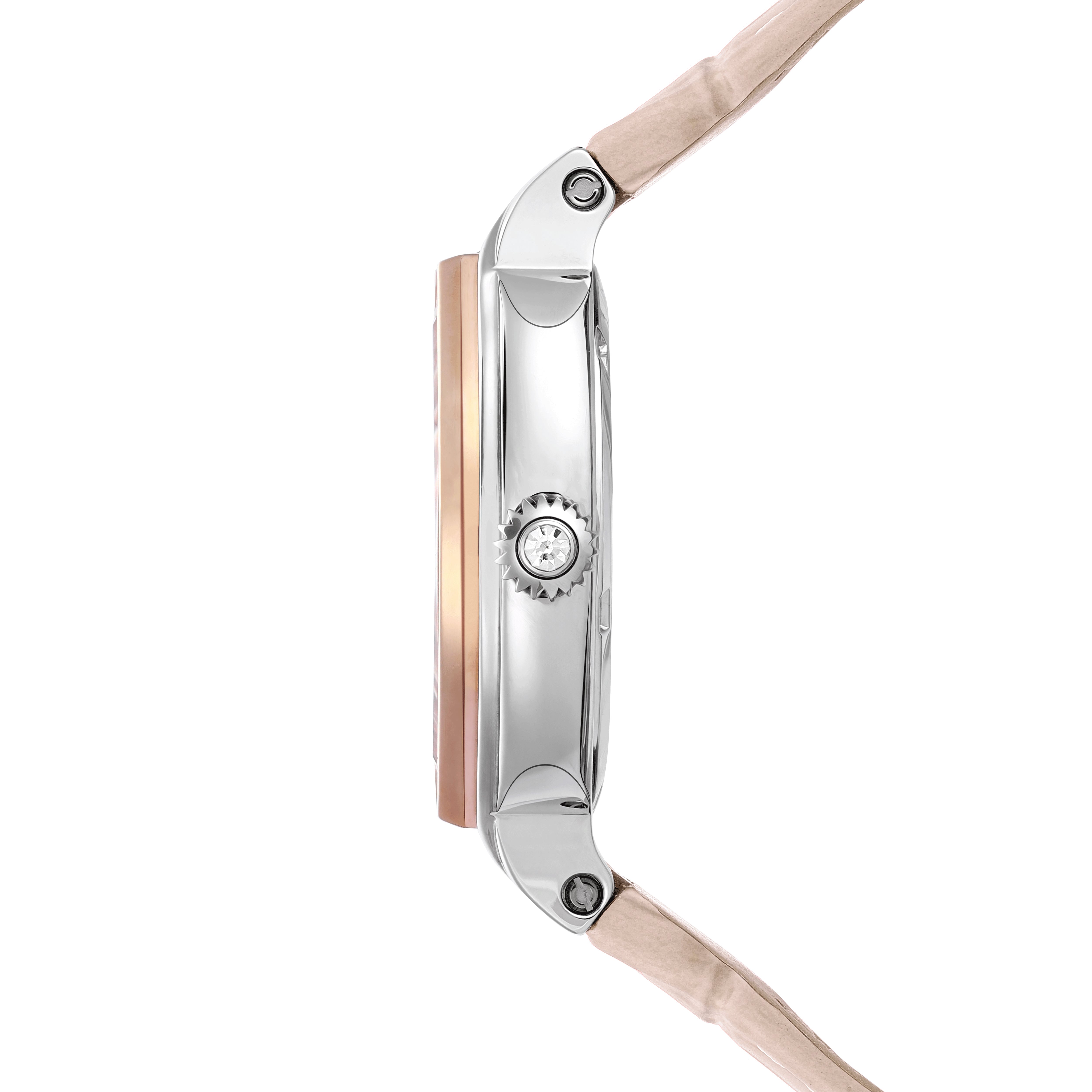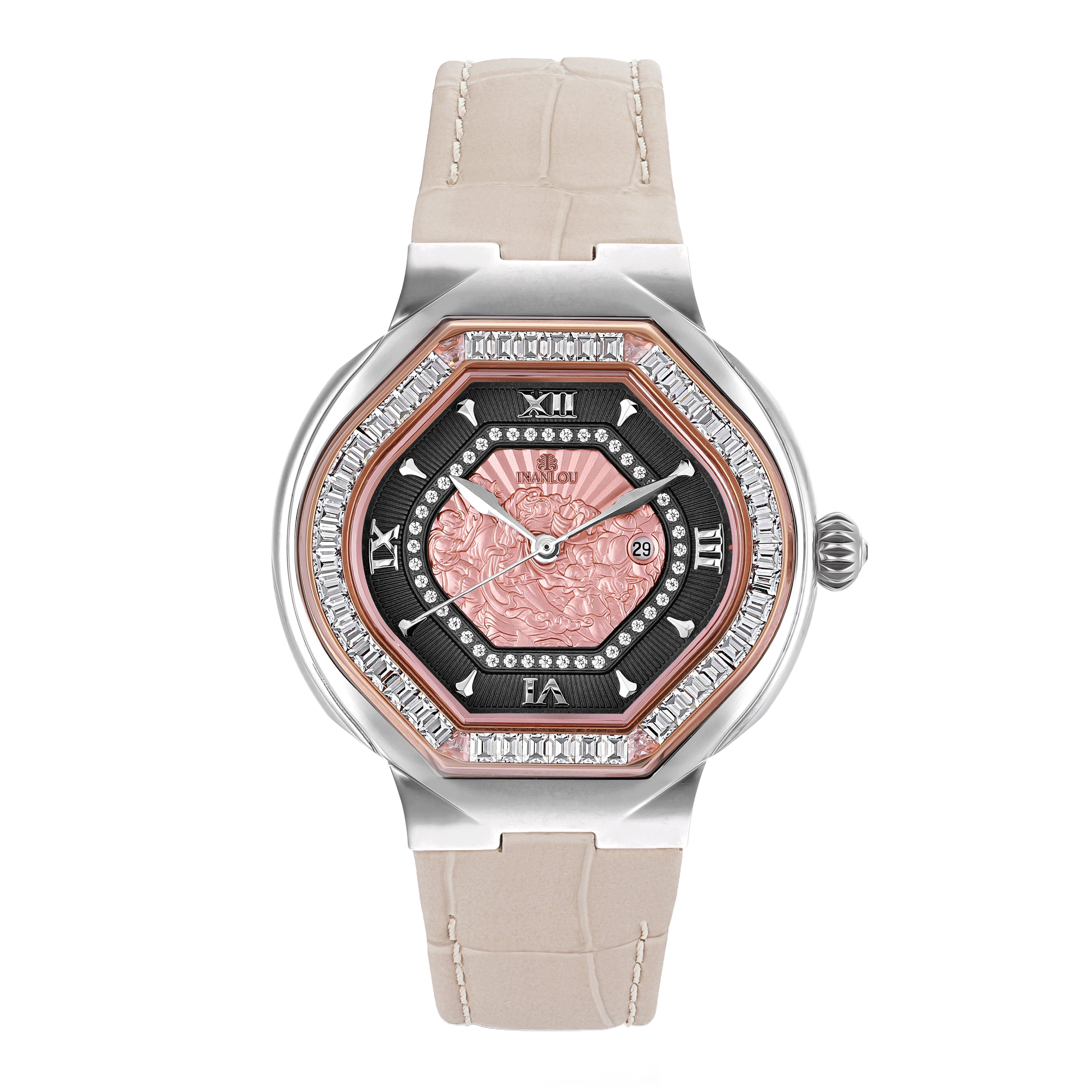 Silk road lady watch with its unique body, multi-layered dial, and a delicately carved piece in the center of it, depicts the story of a beautiful, rich woman from the depths of history, whose servants were attacked by bandits en route to their journey in Silk Road. This attractive and poetic figure comes from a famous Iranian engraving work. Also on the back door, beautiful figures have been engraved. This engraving of the rose gold color is in harmony with the rose gold bezel cover and also creates a nice harmony with the gray color on the rim of the dial, with a border of brilliant Swarovski stones. The numbers and markers as well as the hands and the crown are perfectly designed in harmony with the overall design of the watch. The date index has been placed at three points. The crown is decorated with a Swarovski stone.