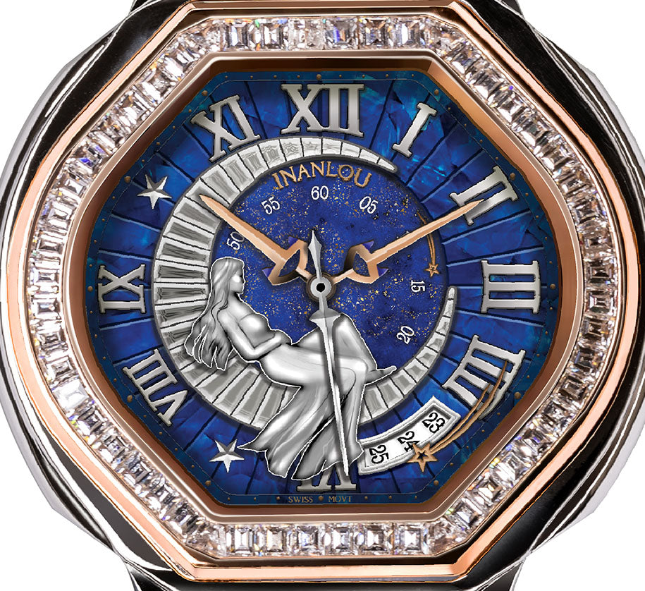 Lady of the Moon Watch with a unique body and distinctive blue dial is a multi-layer blend of fine and high-quality pieces. The Deep Blue color of the Lapis lazuli stone, as a symbol of power, insight, loyalty, and pride, has been used in the central layer, and a shell in the middle layer of it stimulates creativity and insight. These two layers, together with the design of the stars, symbolize the calm and soothing night sky.