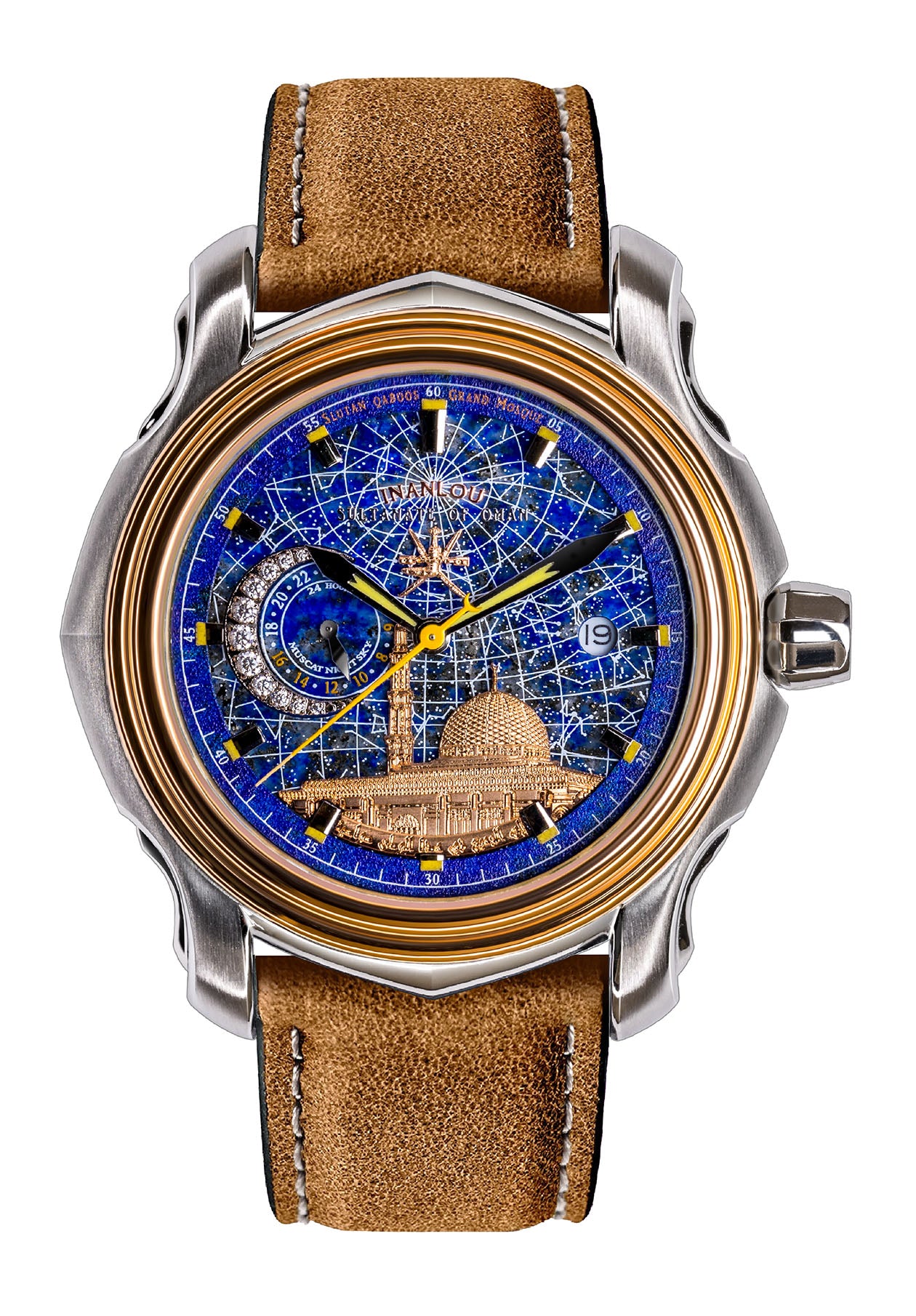 The multi-layered and fine dial of the Oman watch, which is its lower layer made of lapis lazuli stone in a beautiful blue color, is a metaphor for the night sky. The outline of the stars of Muscat sky on it with a beautiful moon covered with Sovarowski stones narrates the calm and relaxing sky of Muscat Nights. The Lapis lazuli stone is a symbol of power and wisdom that balances the soul and the mind.