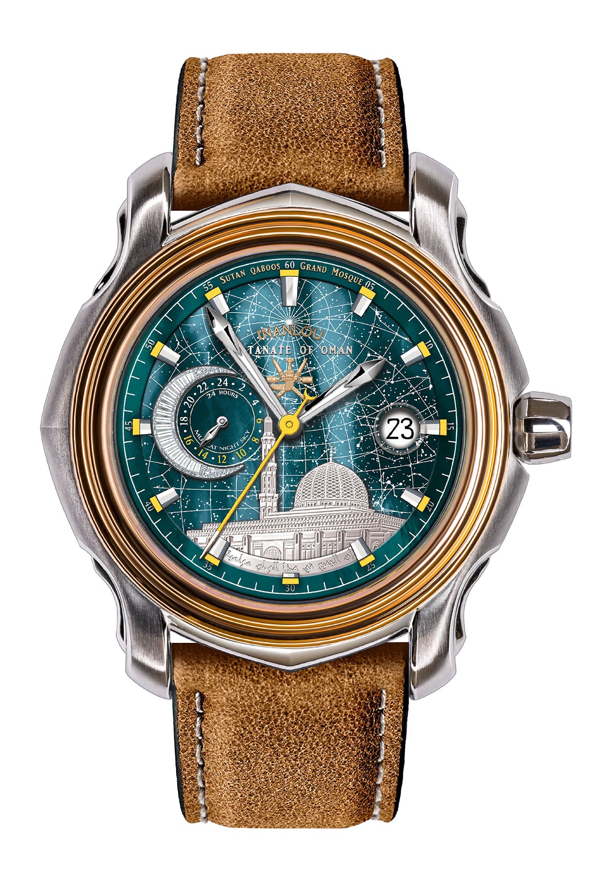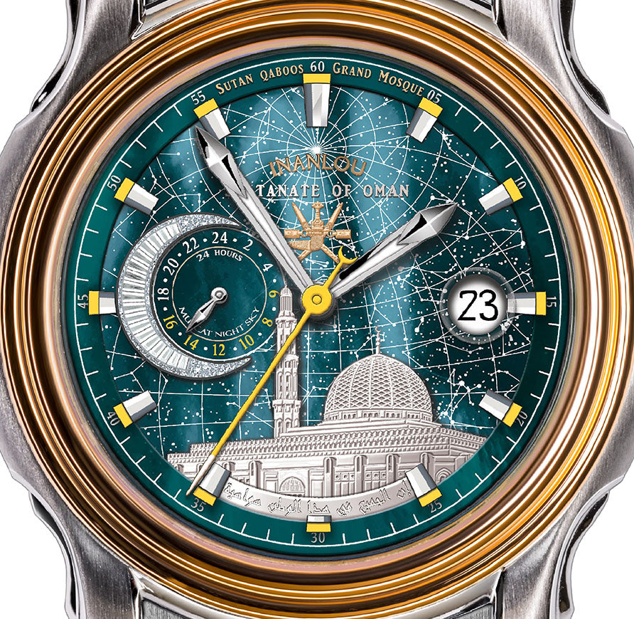 The multi-layered and fine dial of the Oman watch, which is its lower layer made of high-quality Shell stone in a beautiful dark green color, is a metaphor for the night sky. The outline of the stars of Muscat sky on it with a beautiful moon covered with Sovarowski stones narrates the calm and relaxing sky of Muscat Nights.