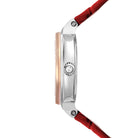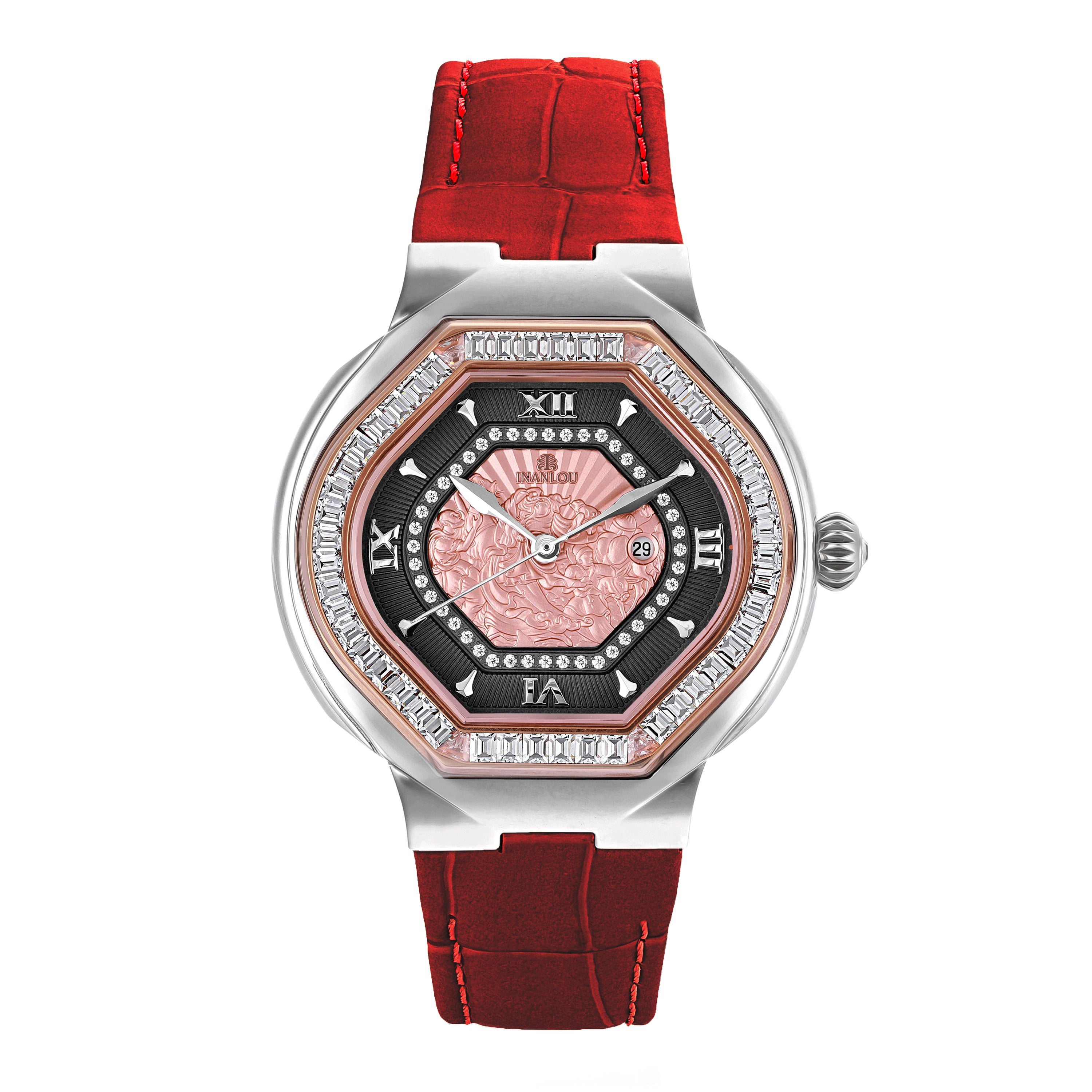 The Silk Road lady watch with its unique body, multi-layered dial, and a delicately carved piece in the center of it, depicts the story of a beautiful, rich woman from the depths of history, whose servants she was attacked by bandits en route to their journey in Silk Road. This beautiful and poetic figure comes from a famous Iranian engraving work. Also on the back door, beautiful figures have been engraved. This engraving of the rose gold color is in harmony with the rose gold bezel cover and also creates a nice harmony with the gray color on the rim of the dial, with a border of brilliant Swarovski stones. The numbers and markers as well as the hands and the crown are perfectly designed in harmony with the overall design of the watch. The date index has been placed at three points. The crown is decorated with a Swarovski stone.