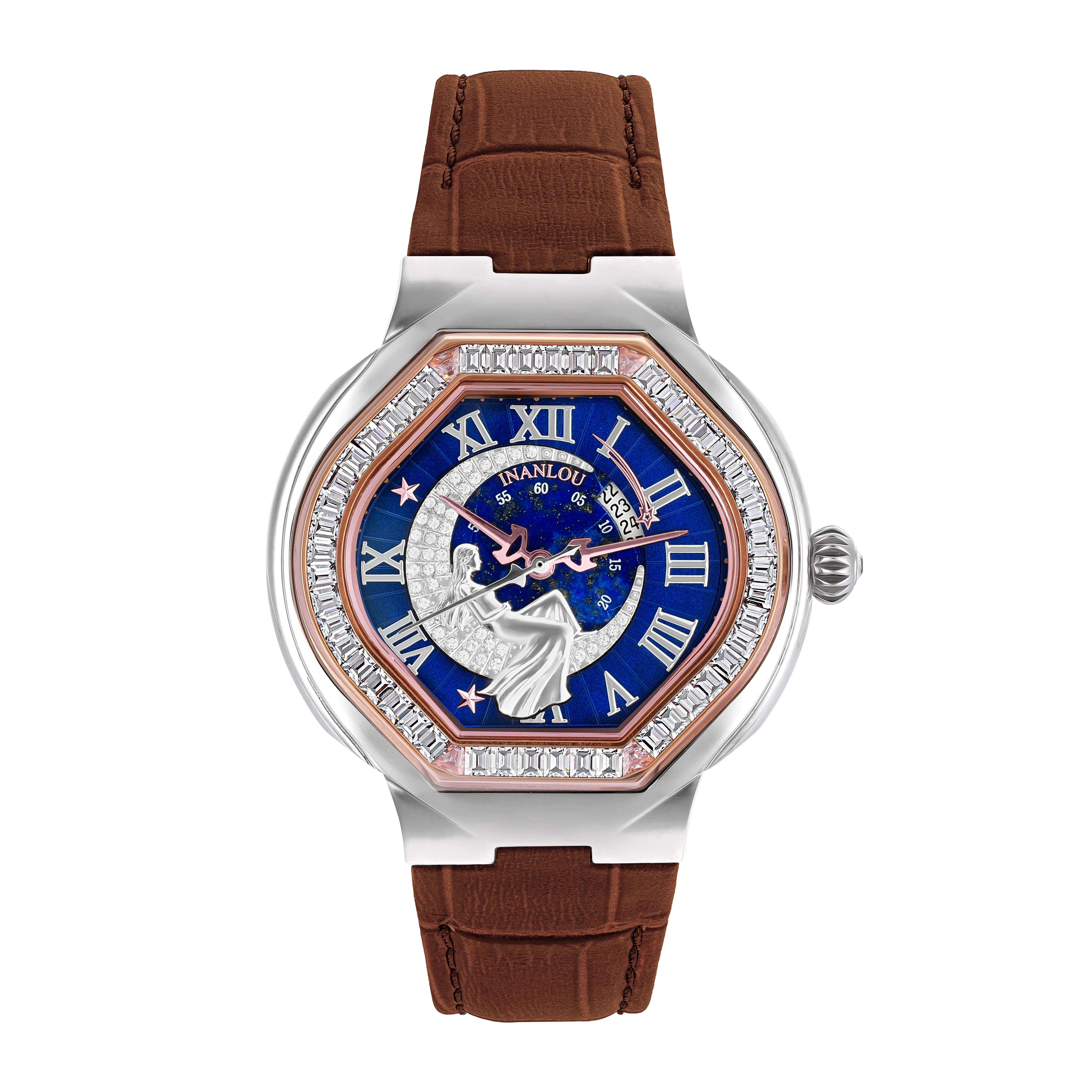 The Lady of the Moon watch with a unique body and distinctive blue dial is a multi-layer blend of fine and high-quality pieces. The Deep Blue color of the Lapis lazuli stone, as a symbol of power, insight, loyalty, and pride, has been used in the central layer, and a shell in the middle layer of it stimulates creativity and insight. These two layers, together with the design of the stars, symbolize the calm and soothing night sky.